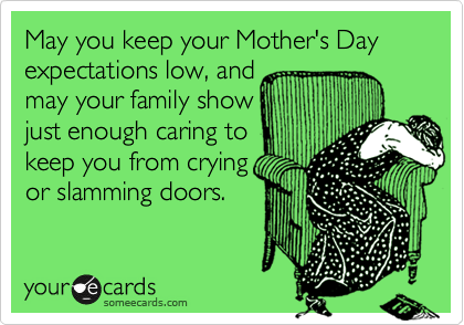 So moms, call your mom and tell her you love her and that you want to thank her for being so amazing. Offer to take her out or make her lunch or dinner or whatever you want to do. It doesn't have to be on Mother's Day. If you have young kids, this day is about you. Spend it recognizing other mothers or not! The important thing is this-just lower your expectations. Mother's Day is infinitely more important to you than anyone else. That's just the way it is. They love you, they appreciate you, just try to relax and enjoy whatever the day brings. Save up all of your stories, call you BFF, and you can bond over your respective days later.